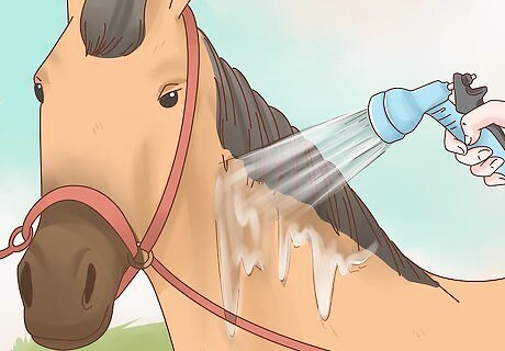 Bathe your horse as needed. If your horse is looking extra dirty, you may want to give her a bath. Start by hosing down her body with warm water to rinse off excess dirt and prep her coat for shampooing. Then, massage shampoo into her coat using a curry brush and rinse. After you have rinsed out the shampoo, massage conditioner into her coat using the curry brush and rinse well. To avoid getting shampoo and conditioner in your horse’s eyes, use a wet washcloth to clean her face.
