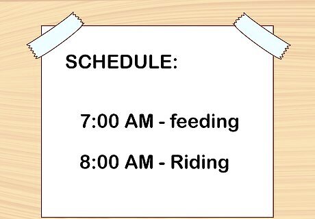 Schedule feedings for an hour before or after you have ridden your horse. Don’t feed your horse right before or right after she has finished doing something strenuous because blood flow will be diverted away from her organs and that can interfere with digestion. Plan feedings around your horse’s scheduled activity. If your horse will be doing something extra strenuous, schedule her feeding for three hours before the activity.