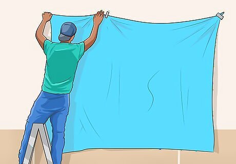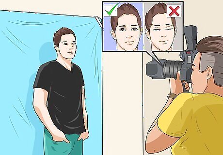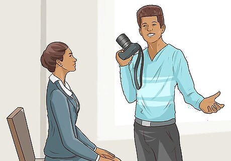 Use a plain backdrop if you have one. A light blue color works well for corporate images. The backdrop can be pinned to the wall using small tacks or tape if you do not have a proper backdrop support. If you do not have any suitable backdrops you should have a plain colored wall behind the subject.