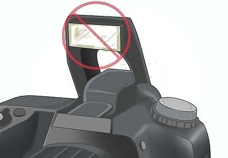 Avoid using the internal camera flash because you have very little control over the lighting and color cast it will produce. Use your tripod and manual settings instead.