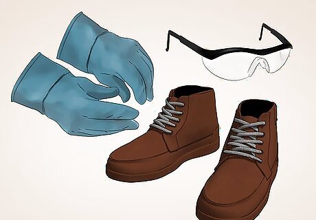 Put on heavy-duty work gloves, boots, and protective eyewear. Choose a pair of thick leather work gloves, any type of work boots, and safety glasses or goggles. This will protect your hands and feet from cuts and pokes while you take up the laminate flooring, as well as protect your eyes against any flying chips. If you don’t have work boots, wear a pair of old closed-toe shoes with a thick sole. Never wear sandals or other types of open-toed footwear for this type of project.
