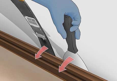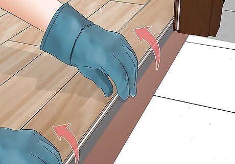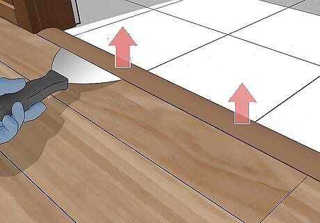 Pry up transition strip molding and remove them using a pry bar. Transition strips are the strips of molding that hide seams where laminate flooring meets another type of flooring or transitions into another room, such as in doorways or where the flooring switches to carpeting. Slide the curved end of a pry bar under a transition strip, starting at one end, and work your way along it, prying it up as you go. These strips aren’t particularly durable, so be very careful as you pry them up if you plan to reuse them.