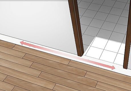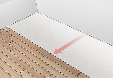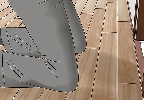 Kneel down perpendicular to the flooring at one edge of the room. Pick a side of the room where the strips of laminate flooring run parallel to the wall. Kneel down on the floor so that you are perpendicular to the strips of laminate flooring and you are 2-3 rows of laminate flooring strips away from the wall. This will give you space to work to remove the first 2-3 rows of laminate flooring strips along that edge of the room.
