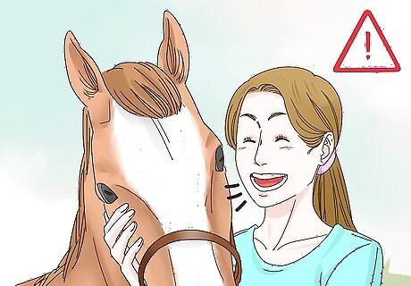 Watch your horse’s facial expressions. Horses use their heads and faces to communicate as well. Watch the way your horse moves his head, eyes, and ears to determine his mood. Good facial expressions from a horse include having his ears forward or relaxed, eyes open and bright, and their head held high. Some negative facial expressions include your horse’s ears being pinned backwards, as well as showing the whites of his eyes. Watch for your horse having his jaws open with teeth exposed, as this is also a sign of aggression.
