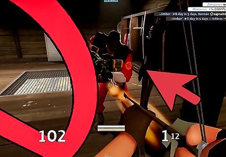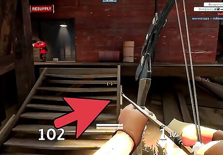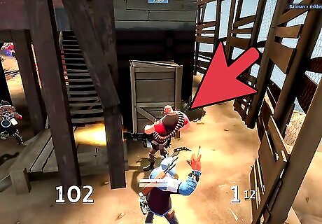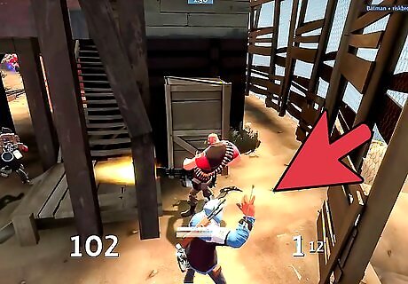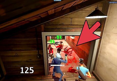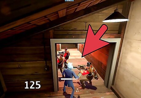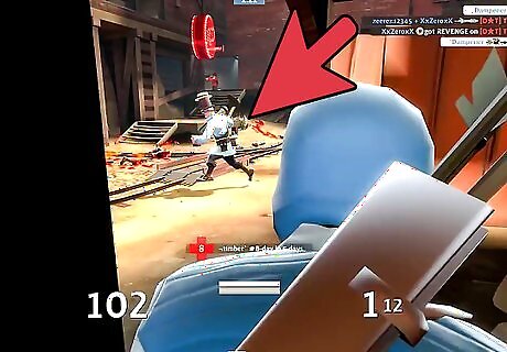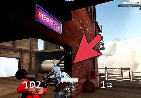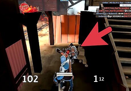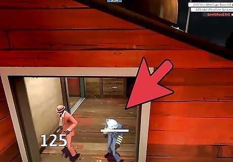 Make your way to your target. Try to flank your target or take a route that isn't used as often, as this will reduce your chances of getting spotted or having to confront an enemy. Use all of the mobility options your class has available to get to your target quickly. Scout: Use the Scout's double jump and his natural quickness to get to your target quickly. The Scout also has many weapons that help with mobility, such as the Atomizer (allows you to triple jump), the Baby Face's Blaster (speed boost from dealing damage), the Bonk! Atomic Punch (grants invincibility), the Crit-a-Cola (increases speed when ingested), the Force-A-Nature (triple jumps from the knockback of firing it), the Soda Popper (three extra jumps when boost meter is full), and the Winger (higher jumps when active). Soldier: Make use of rocket jumping. To rocket jump, shoot a rocket at your feet as you press jump and crouch. The rocket's explosion will propel you forwards. Pyro: The Pyro can hold the Powerjack to gain a small speed boost, or the Pyro can flare jump with the Detonator. To flare jump, the Pyro must shoot a flare at his feet while pressing jump and crouch Demoman: The Demoman can use any of his shields (Chargin' Targe, Splendid Screen, or Tide Turner) to get a burst of speed, or can sticky jump with any stickybomb launchers. To sticky jump, place a stickybomb on the ground and detonate it with right click while pressing jump and crouch. Heavy: The Heavy can use the Buffalo Steak Sandvich to gain a speed boost, however be aware that this makes it so he can only use his melee weapon until the effect wears off. While the Heavy's Gloves of Running Urgently also boost speed, they don't have a taunt kill, meaning they can't be used if you want to taunt kill. Engineer: The Engineer can place teleporters to help him get closer to his target, or the Engineer can use his Wrangler and a mini-sentry to get to high places by standing on his mini-sentry, aiming the Wrangler up, and then shooting himself to propel himself upwards. Medic: The Medic can use the Overdose to get a small speed boost, as long as he has at least 10% of his UberCharge built, or he can use the Quick-Fix to gain any mobility boosts the person he is healing has, such as the Scout's speed. Sniper: The Sniper does not have a weapon that grants him increased mobility, however the Sniper is relatively quick naturally, so use this speed to your advantage. Spy: The Spy can use his cloak and disguised to make it to his target without confrontation. With these, you can take the main route and not have to resort to detours (if the main route is faster), as you will not be confronted if you are disguised or cloaked.