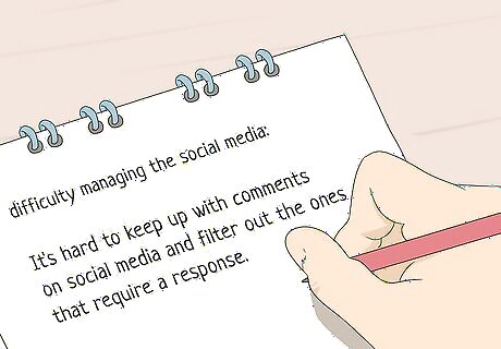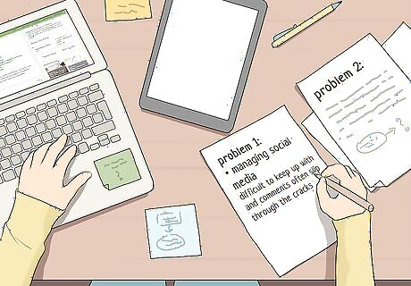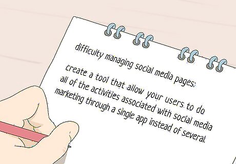 Brainstorm a list of problems that you experience regularly. When you're looking for a problem to solve, you can sometimes be your own best customer. If you can tap into problems that you encounter on a regular basis, there's a chance that many others are dealing with the same things. Start by listing 5 or 6 problems that you find frustrating or mentally painful to deal with on a regular basis. For example, you might get really frustrated trying to manage social media. You know that your company should have a social media presence and engage with consumers, but you find it difficult to keep up with and find that comments often slip through the cracks. If you already have an idea or a product in mind for your startup, think of problems that your product or idea could fix. This list doesn't just apply to you personally. It could also be problems that you've heard people experience, even if you don't deal with it yourself.