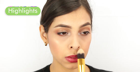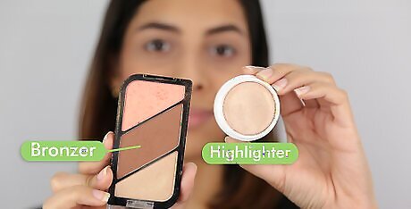 Add highlights. Apply your highlighter under your eyes and down the bridge of your nose to brighten those areas. This will make the contoured and bronzed area of your face stand out more in contrast to the highlights – dark colors recede and light colors “pop.” If you chose to use cream contour and bronzer, you will need to set the makeup with a setting powder to keep the cream long-lasting and from smearing too easily.