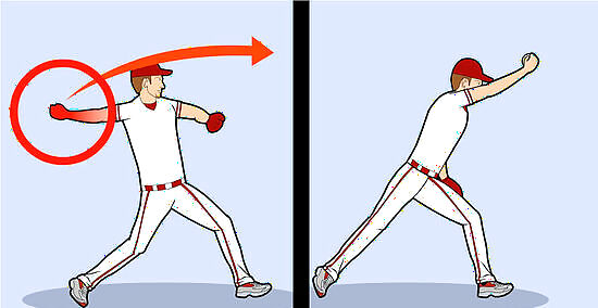 Follow through. Do not let the arm drift back in toward the body, as per normal American baseball customary motion. Your arms should be totally across the body.