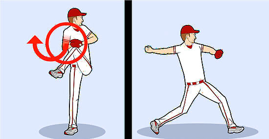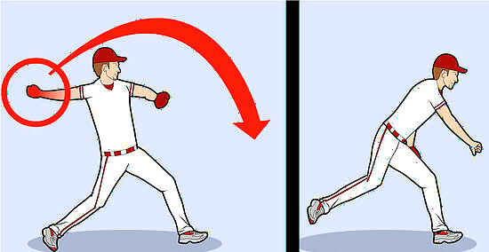Rotate your arm. Rotate your arm away from the body. After you have pulled the arm back, rotate your arm forward and away from the body with your palm facing third base for a right-handed pitcher and first base for a left-handed pitcher. The pitching arm will come forward and down so that the back of your hand will face you.