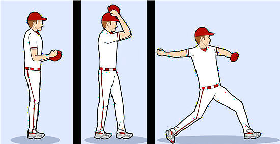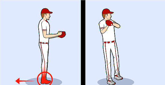 Step back. Take a small step backwards with the same foot as your pitching hand. You’re pitching hand is usually called your stride hand. As you do that bring your pitching hand and glove to your head.