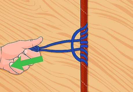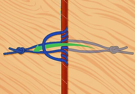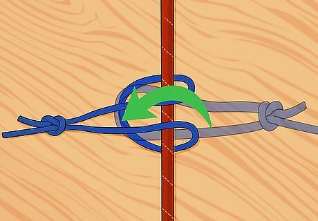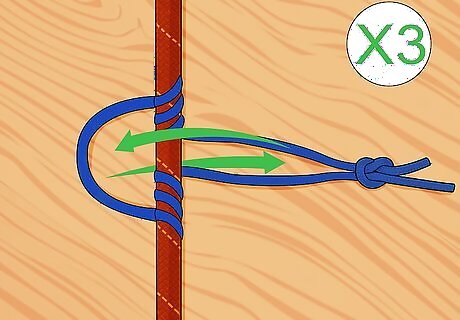 Repeat two more times, coiling inwardly each time. Continue to wrap the long end of the loop inwardly around the standing line at least three times in total. Each time, you will wrap the long end of the loop over the standing line, then through the small end of the loop on the inside of your previous coil, then underneath the standing line over to the other side. Your wrap will get narrower each time, so make sure to start with enough space for at least three inward coils. The windings will never overlap but will coil inwardly instead. A three-wrap Prusik is standard, but a Prusik can be formed with only two wraps or up to five. If there is not a large difference between the diameter of the loop and the standing line, you will need to wrap the loop more times, up to five. But if there is a good difference in diameter between the two, the standing line being at least twice as thick, a three-wrap Prusik will suffice.