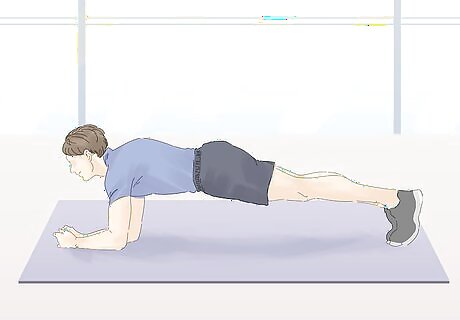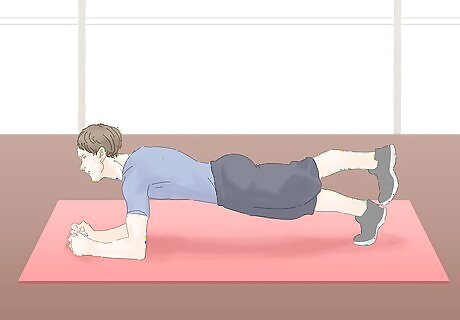 Try various plank positions. The plank is a great isometric exercise that works a variety of your core muscles. In addition, there are many variations that can target specific abdominal muscles. Get down into a push-up position with your arms extended straight and your wrists underneath your shoulders. Prop yourself up on your toes and keep your back completely straight. Contract your back muscles, thighs, glutes and abdominal muscles for the maximum benefit of this exercise. Hold as long as you can and repeat 2-3 times or as you're able.. You can also do a side bridge or side plank. Pull yourself into the original plank position to start. Then rotate your body so that you're leaning on one arm and your torso is perpendicular to the floor. Rest your top arm on your hip. Again, tense all muscles in your body to get the maximum benefit of this exercise.