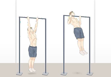 Perform pull-ups with an overhand grip. This exercise will work your back and biceps, with more emphasis on your back. Place your hands on the bar slightly wider than shoulder-width apart with your palms facing away from you. Slowly pull yourself up and stop when your chin is just above the bar. Pause, then slowly lower yourself back down all the way. Repeat for 3 sets of 12.