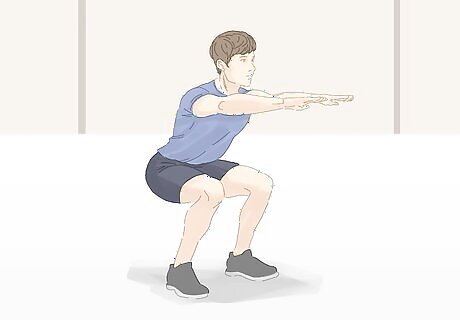 Include squats. The squat is a great isometric exercise that can strengthen all of your leg muscles in one move. Stand with feet slightly wider than hip width apart and arms by your sides. Squat down, like you're going to sit on a chair. Stop when your thighs are almost parallel to the floor. Your buttocks should be pushed out behind you and your head should be facing straight in front of you. Hold this position as long as you can and repeat 2-3 times. To make this exercise more difficult, consider holding a dumbbell in each hand for added weight.