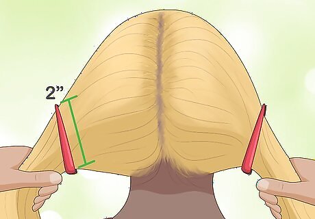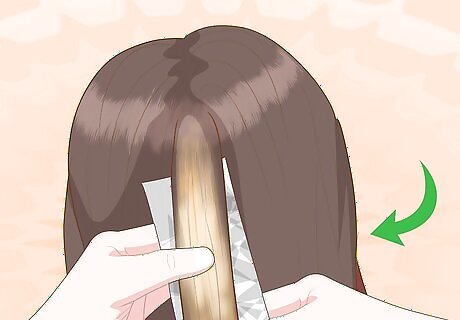 Divide your hair into sections that are about 2 inches (5.1 cm) wide. When you’re working with 2 shades, it’s often easier to color your hair if you divide it in sections before you start. This can also help you figure out how many pieces of foil you’ll need. To keep the sections of hair separated, use small clips or even bobby pins to hold them in place.