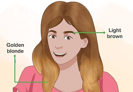 Opt for a brighter tone for the ends of your hair. Incorporating a brighter shade at the ends of your hair provides a more natural look. Choose a color that’s 4 to 5 shades lighter than your brows so the colors will blend into one another well. For example, if your roots natural roots and brows are a light to medium brown, you might use a golden blonde shade for the ends of your hair.