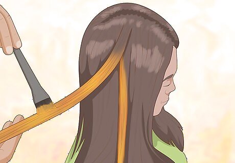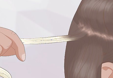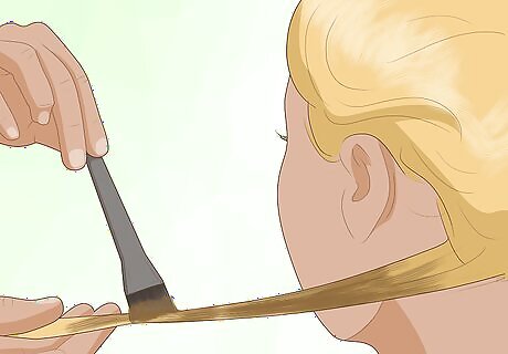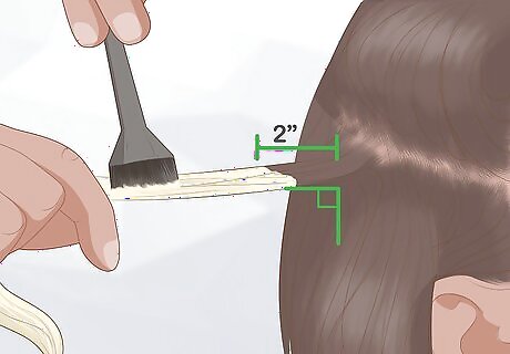 Lift a section of hair on 1 side of your head. Starting on one side of your head, pick up the first section of hair beneath the roots. Hold the hair straight out from your scalp at a 180-degree angle, or a 90-degree angle for areas like your nape or the sides of your head. Apply the dye approximately 2 inches (5.1 cm) beneath your roots. For the best application, it helps to hold the section of hair fairly taut.