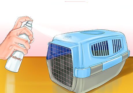 Spray the carrier with pheromones. Pheromones or calming synthetic cat scents, like Feliway, are a great way to minimize any anxieties your cat may have about the carrier. Pheromone sprays produce a familiar smell that may help calm your cat. Spray the carrier 15 to 30 minutes before placing your cat inside of it.