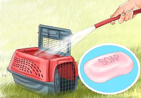Clean the carrier with soap and water. Do not use cleaning products to clean the carrier, since the scent of these products is off-putting for cats. Instead, use mild soap and hot water to clean the carrier. Take the carrier apart and clean it with a scrub brush. Then rinse it with water and leave it outside to dry in the sun. Cleaning the carrier will give it a neutral scent and may help it smell less like the vet’s office.