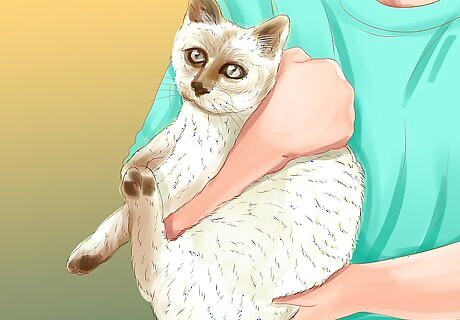 Pick your cat up under its front legs. Hold its hind legs with your other hand and arm, supporting its bottom. Then, begin to lower your cat into the carrier backwards, i.e., rear end first. This will help your cat feel like it is not being forced into the carrier. If your cat begins to panic at the sight of the carrier, then cover your cat’s body with a towel before picking it up. The towel will prevent your cat from using its arms and legs as a way to resist going into the carrier. It will also prevent scratching.