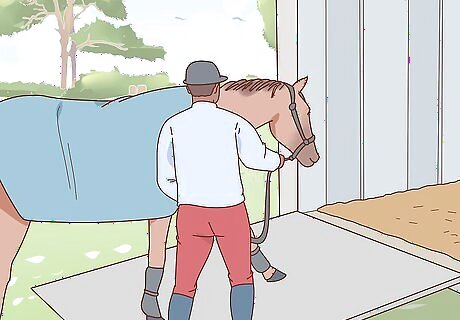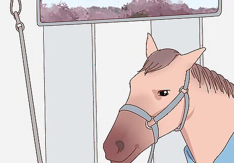 Tie up your horse inside the vehicle by its lead rope. As soon as you've directed your horse into its stall or chute, close the compartment door behind it to prevent it from escaping. Knot the lead rope around one of the rings on the upper wall or ceiling so your horse isn't tempted to wander while the vehicle is in motion. If time permits, spend a few minutes petting and talking to your horse before you lock up the truck or trailer and get your journey underway. When you’re ready to unload, be sure to leave the door or gate of your vehicle closed until you’ve untied the lead rope and have control over your horse. Otherwise, it might bolt when it catches sight of the outdoors.