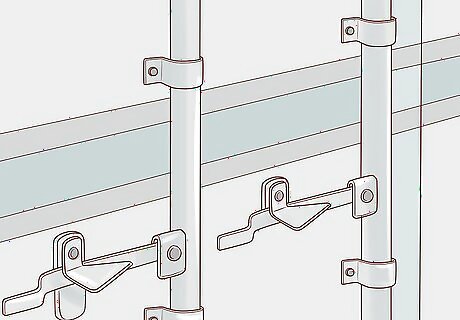 Close and secure the door to the truck or trailer. Most horse trailers and lorries have single or double gate-style doors that swing open and closed. You should hear a faint click as the doors catch. Once they're shut, engage the locking latch or lower the butt bar across the doors and insert the latch pin to make sure they don't come open accidentally. It's essential the doors be correctly closed and locked. Otherwise, the trailer will be unsafe for your horse. Different vehicles come equipped with different locking mechanisms. Take some time to familiarize yourself with the design of your transport to minimize the chances of a mishap on the road.