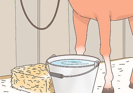Provide food in a hay net and water in a secure container. Fill a hay net completely and attach it to the inside of the trailer where your horse can easily reach it. Additionally, provide plenty of fresh water in a container or bucket that's secured at either ground level or shoulder-height for your horse. Make sure your horse is facing its food and water supplies so it can easily consume them. Having food in front of it will cause your horse to move its head around to eat and drink. Continual head movement will reduce your horse’s risk of contracting “shipping fever.” Shipping fever is a respiratory illness that’s common among horses transported long distances in close quarters. It occurs when the animal is unable to drop its head to cough, which can result in bacteria being trapped inside its lungs. Be sure to refill your horse’s food and water every few hundred miles to pacify it and keep its energy up.Tip: Consider adding a liquid electrolyte solution to your horse’s water to encourage it to drink frequently and keep it hydrated longer.