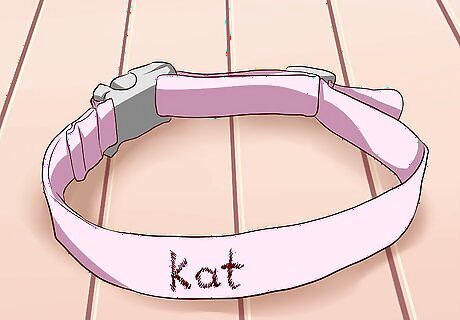 Have proper identification for your cat. Regardless of how you're traveling, get a flat, customized collar that has your contact information sewn into the collar material. This way, you can avoid attaching dangling tags to your cat's collar which might get stuck in crate doors or crevices during travel. Or, you could ask your veterinarian to implant a microchip under your cat's skin. The microchip will contain all of your contact information in case your cat escapes and loses her collar. You can order a customized collar at your local pet store or on the internet.