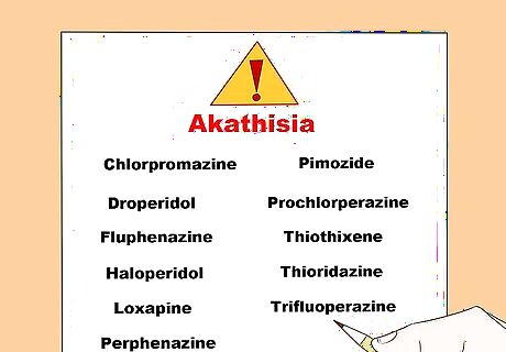 List the psychotropic medications you're taking. Pharmacists and doctors agree that akathisia is a side effect of some medications, especially neuroleptics, selective serotonin reuptake inhibitors (SSRIs), and first-generation antipsychotics. Write down a list of medications you're on so you can give it to medical personnel if needed. Keep in mind that these medications may increase your risk for akathisia: Chlorpromazine Droperidol Fluphenazine Haloperidol Loxapine Perphenazine Pimozide Prochlorperazine Thiothixene Thioridazine Trifluoperazine