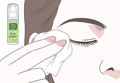 Use a diluted tea tree oil scrub or oil on your eyelids if you have mites. You can wash your eyelids with a tea tree oil scrub that contains 50% tea tree oil or apply a 5% tea tree oil ointment to your eyelids to help treat mites on your eyes. Follow the manufacturer’s instructions for use and make sure to check with your doctor first, especially if you are using another over-the-counter or prescription ointment or eye wash. Look for tea tree oil eye wash and ointments at your local drug store or online.