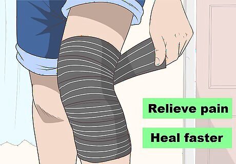 Wrap the knee with a support or strap. Buy a knee strap and wrap it right under your knee. Wrap it several times so it supports the muscle right beneath your kneecap. The wrap will relieve some of the pressure on your muscle, which can relieve pain and make the muscle heal faster. Knee straps are also called infrapatellar straps or Cho-pat straps. You can buy them in most pharmacies or medical supply stores.
