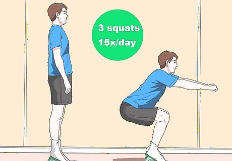 Do eccentric squats on raised heels. Stand against a slanted foam roller or board so your heels are raised up at the back. Slowly squat down and then stand up a little quicker. Put your weight on the good knee instead of the knee that's healing. Do 3 squats 10 times a day when you start out. Work your way up to 3 squats 15 times a day.