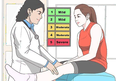 Diagnose the severity of your jumper's knee. Your doctor will watch you run, jump, kneel, and move your knee to determine the level of your injury. The doctor will grade your jumper's knee from 1 to 5. Grades 1 and 2 are mild injuries, but grade 5 represents severe and constant pain. If your doctor suspects you have a bone injury, they might order an X-ray. If they think you have a full tear, your doctor might order an MRI. However, a minor case of jumper's knee may not require any imaging tests. The doctor will use the diagnosis to create a treatment plan for your knee. Low level injuries will improve with rest and support, while a more severe diagnosis will need more intensive treatments.