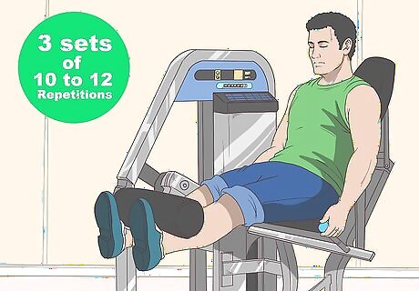 Use a leg extension machine for more strength training. If you're not comfortable with putting weight on the knee while you exercise, sit down and use the leg extension machine. Extend a single leg with light resistance and try to do 3 sets with 10 repetitions when you start out. Work up to 3 sets of 10 to 12 repetitions once your knee feels stronger.