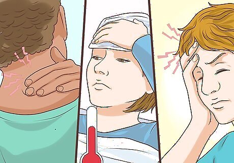 Know symptoms of meningitis like stiff neck, fever, and headache. Headaches, fever, and nausea can occur for a number of reasons, and are common in simple, non-threatening illnesses. If your symptoms are more severe or different than how you typically feel with a cold though, you should seek evaluation. Familiarize yourself with the signs and symptoms of meningitis and watch for specific combinations of symptoms that may suggest meningitis over another illness. For those over the age of 2, watch for the following symptoms: Stiff neck Headache High fever of 102°F (39°C) or higher Discomfort looking into bright lights Sleepiness Nausea or vomiting Confusion Seizures Skin rash