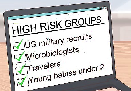 Know if you are in a high-risk group. Certain groups of people are at higher risk of getting meningitis. It is especially recommended that these groups get vaccinated against the illness. Be aware if you are in one of the following high-risk groups: U.S. military recruits Anyone who has a damaged spleen or whose spleen has been removed College students living in dormitories, and other groups living in close proximity Microbiologists or other healthcare professionals exposed to meningococcal bacteria Anyone who has terminal complement component deficiency (an immune system disorder), or are otherwise immunocompromised Anyone traveling to countries which have an outbreak of meningococcal disease. If traveling overseas, check to see if the vaccine is recommended – you should receive the vaccine at least 1 week before departure. Those who might have been exposed to meningitis during an outbreak Young babies, under the age of 2