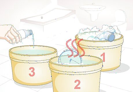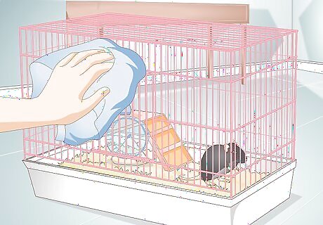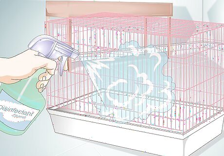 Clean and sanitize the cage accessories. Use 3 buckets to clean and sanitize the cage accessories. Fill the first bucket with hot, soapy water and clean the accessories. Fill the second bucket with hot water to rinse off the accessories. Fill the third bucket with a cold bleach solution (1/2 tablespoon bleach/1 gallon water) and let the accessories soak for about 30 seconds. Let the items air dry before putting them back in the cage. A toothbrush may help clean the edges or hard-to-reach spots of the accessories.