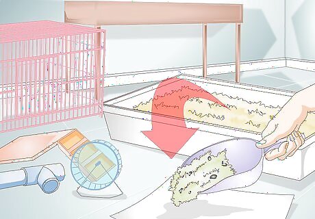 Take everything out of the cage. First, move your mouse to a separate cage by gently picking it up by the base of its tail and sliding your other hand under its body. Slowly lower your mouse into the other cage. Next, remove the bedding and litter and take out all cage accessories (toys, food bowl, water bottle).