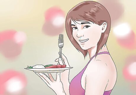 Improve your eating habits. Eat a more balanced diet filled with plenty of fruits, vegetables, whole grains, and low-fat dairy products. You should also consider making alterations to your diet that can help keep your blood sugar levels in check. Since PCOS is linked to insulin resistance, maintaining stable blood sugar and insulin levels can be important. Follow a low-carbohydrate diet, eating only complex carbohydrates high in dietary fiber. Eat moderate amounts of high-quality carbohydrates—vegetables, fruits, beans, and whole grains—and avoid low-quality carbohydrates—sugary foods, white/refined grains, fruit juice, and baked goods. Enjoy foods high in carbohydrates alongside lean proteins—poultry, seafood, lean beef or lean pork, eggs, low-fat dairy, nuts, and whole soy foods—to help curb the rise in blood sugar that occurs after the consumption of carbohydrates.