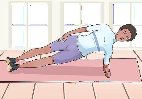 Perform side planks to engage the oblique muscles. These muscles protect the spine against sudden twisting movements and provide additional support to your back. Start by laying on your left side on a soft surface like an exercise mat. Lift your body off the surface by supporting your weight with the left elbow and outer side of the left foot. Your left shoulder should be tracking straight over your left elbow. Maintain an erect posture as if you are standing tall. Look straight, brace your abdomen, keep the shoulders back and down, and squeeze your butt. You should maintain this position for 10 seconds by continuously engaging your left oblique muscles (the muscles at the side of your belly). This can be a very challenging move. If you are struggling, try staggering the feet for more support, or performing with the left knee down. Do three sets of 10 second holds. Work your way up to 30-second holds with proper form. Switch sides and repeat.