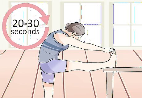 Stretch your hamstrings. A standing hamstring stretch is an exercise that can help treat sciatica pain by stretching and lengthening the hamstring (back of your thigh) muscles. Stand in front of a low table or sturdy box. Place one heel on the table or box on it while standing straight and keeping your foot flexed and toes pointed to the ceiling. Slowly bend over at the waist, making sure to keep your back straight. Try to touch your toes, as much as you can until you feel a slight stretch in your hamstrings. If you're not able to touch the toes, rest your hands on your shin or knee for a more comfortable position. Hold the stretch for 20-30 seconds, then return your foot to the floor. Repeat this stretch two to three times per leg.