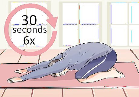 Try child's pose. Although a common pose to yoga, the child's pose is another exercise that can cause the comfortable, forward bending stretch that can help alleviate sciatica pain. Sit on your knees on a carpet or exercise mat. Lower your forehead to the ground and rest your head comfortably. Stretch your arms out in front of you and over your head and just allow them to relax, palm-side down on the mat or carpet in front of you. Hold this position for 30 seconds and repeat four to six times as you're able and feel comfortable.