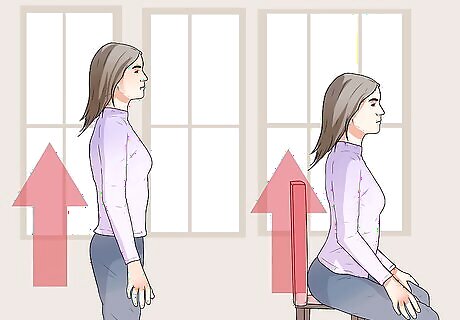 Maintain good posture. Maintain correct posture while standing, sitting, or even sleeping. This can help ensure that you're not aggravating your condition by posture. When standing, keep your shoulders pulled back, yet relaxed. Lift your head up tall as if there is a string attached to the middle of your head and is pulling you upwards. Pull in your stomach slightly and put equal weight on both feet. Sit with your back straight and use a pillow to support your lower back, with your feet stable on the floor. Like standing, keep shoulders pulled back and relaxed. When sleeping, make sure that your bed mattress is firm and distributes your body weight evenly, while supporting your back in a straight position.