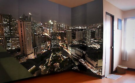 Hang the photo wallpaper. Follow the instructions provided by the retailer who has produced your photo wallpaper. As with any application of wallpaper, ensure that the wall is cleaned properly first and that all traces of old wallpaper or flaking paint have been removed. If you are centering an enlarged photo piece of wallpaper, measure with great care. If you decide that the application is too difficult for you to do, get help from friends or family, or call in a professional. It's better to seek the help than to apply wallpaper unprofessionally––botched wallpaper is instantly obvious to everyone.
