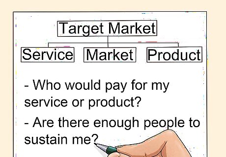 Determine your target market. You will most likely be offering some type of service or product, so it is important to consider ahead of time what demographic of people you will be marketing to. If you plan to carve canoes out of logs, you probably won’t have much of a market in the city. If your passion is repurposing old junk into modern art pieces, you need buyers with disposable income. Ask yourself, who would pay for my service or product? Then ask yourself if there are enough of those people to sustain you.