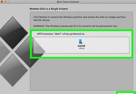 Do one of the following based on your Mac's disk: If your Mac has a single internal disk, click Restore. If your Mac has multiple internal disks, select the one that has Windows on it, select Restore disk to a single macOS partition, then click Continue.