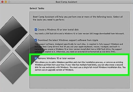Open the Boot Camp Assistant, then click Continue. If the Select Tasks step appears, select Remove Windows 10 or later version, then click Continue.