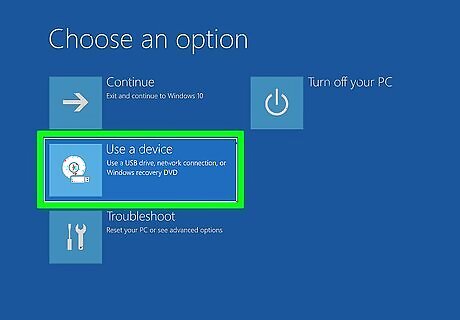 Select Use a device. When this menu opens, you should see the installation media you made earlier. If you don't see your installation media, make sure it's still plugged into your computer. If it is, you may need to enter your computer's UEFI settings menu to boot into it. Go back to the main menu, then select Troubleshoot, Advanced Options, and UEFI Firmware settings Once you're in the UEFI menu, use the keyboard (or mouse if you get a graphical menu) to navigate to a boot menu and select your device if it's there. If it isn't, plug the installation back in and go through the same process above to enter your UEFI menu and try to boot into it.