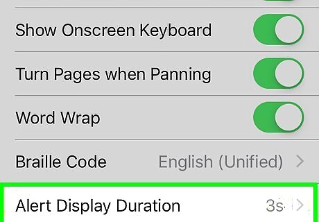 Tap Alert Display Duration. This will change how long an alert or notification is shown on the braille display. Tap + or - to increase or decrease the duration.