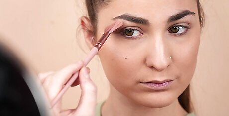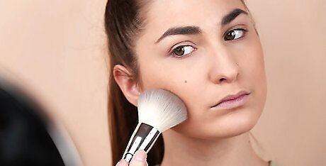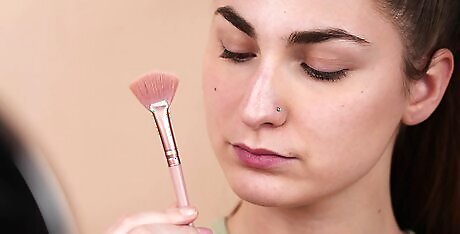 Apply blush using a fan brush for a rosy glow. Rub your fan brush into some blush, and then apply it to the top of your cheekbones. Use a backwards sweeping motion to create a soft, natural glow. Use the wide side of the brush to make your rosy glow look natural and blended. Tap your brush against the blush compact to get rid of any excess blush before applying it. Choose blush that complements your skin tone. For example, if you have fair skin, you'd want a blush in pale pink.